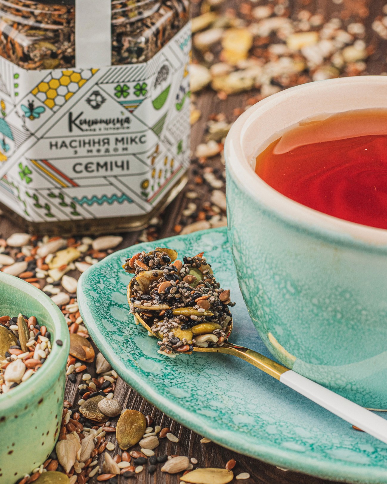 Bzzz… honey, but with a twist: with crunchy seeds, in soft creamy textures, and with flavors that brighten any meal — from breakfast to dinner. For this project we chose natural ingredients, handmade props and backgrounds to create the cozy feeling of homemade honey, passed down from generation to generation. Sweet, warm and real — a story that works beautifully for albums, online shops or social media.